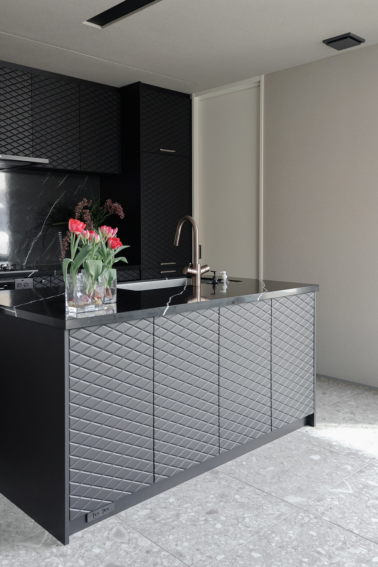 布地を思わせるふっくらとしたダイヤ柄の扉「キルト」を採用したT様。