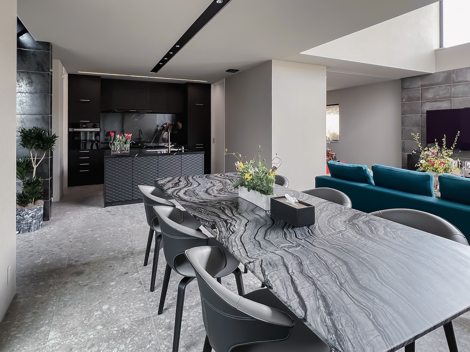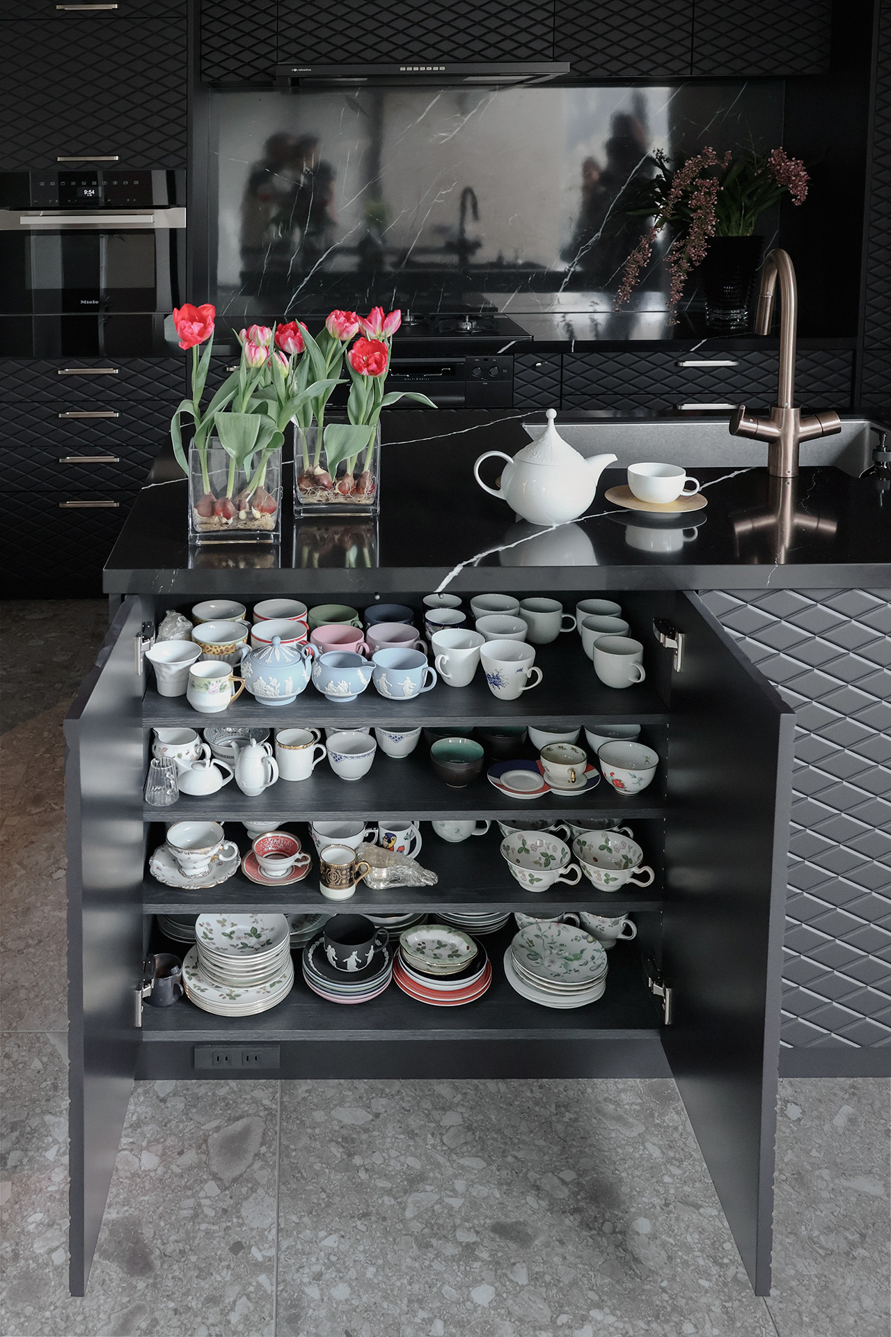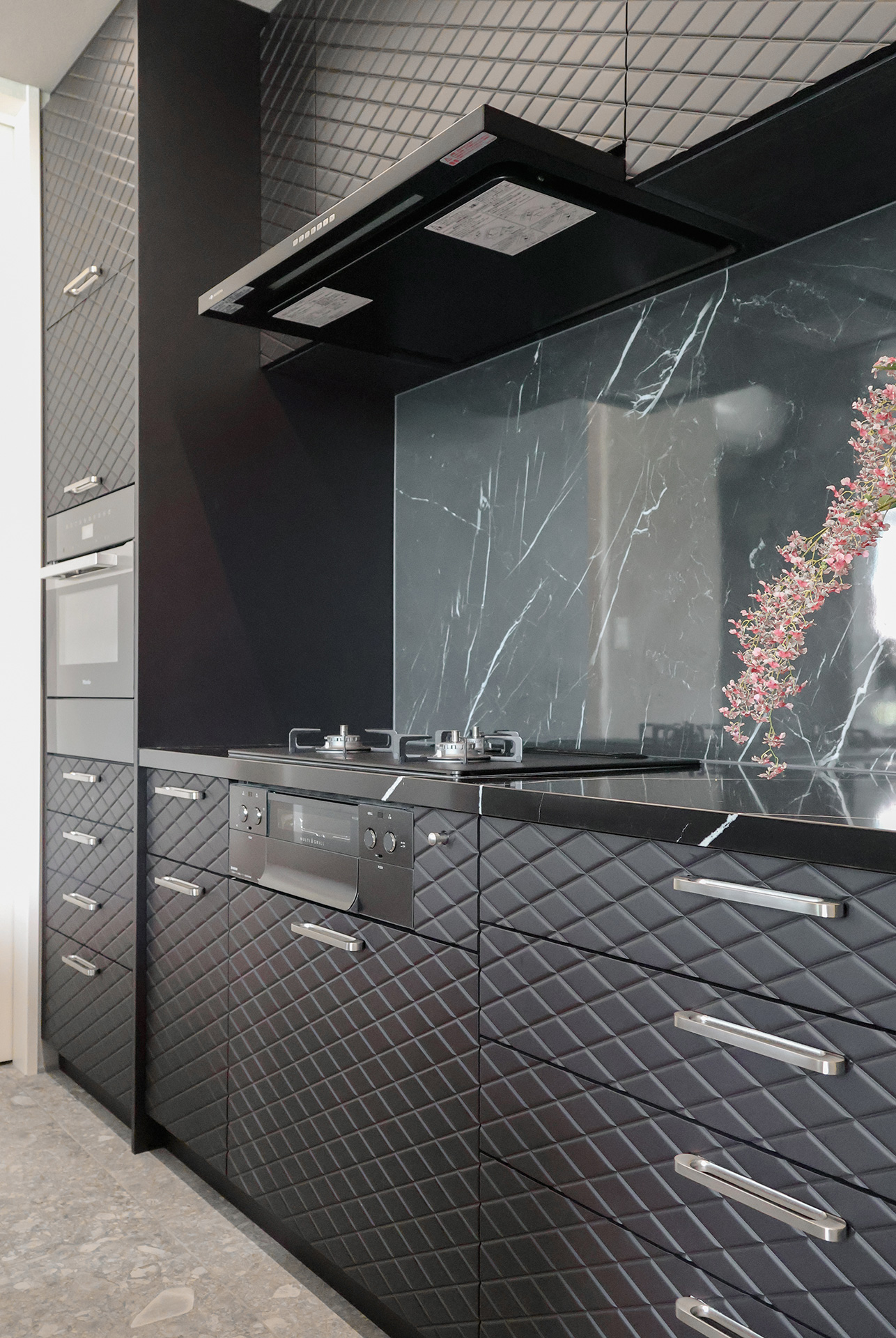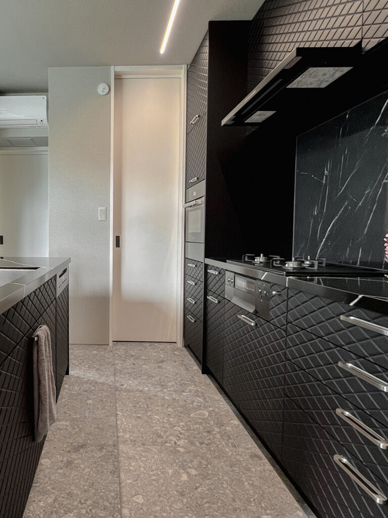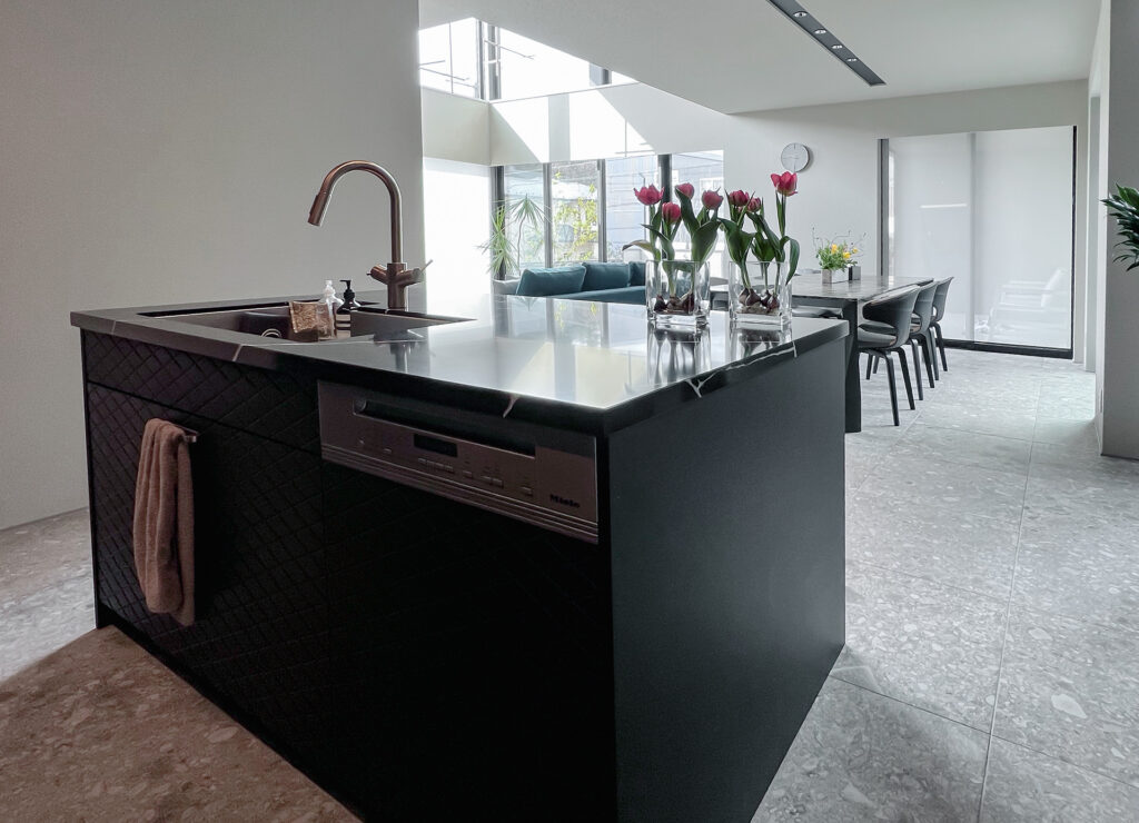 ブラックのキッチンのアクセントとして美しくおさまっています。