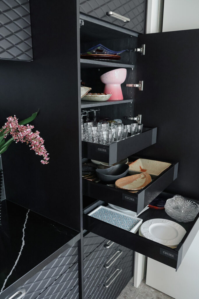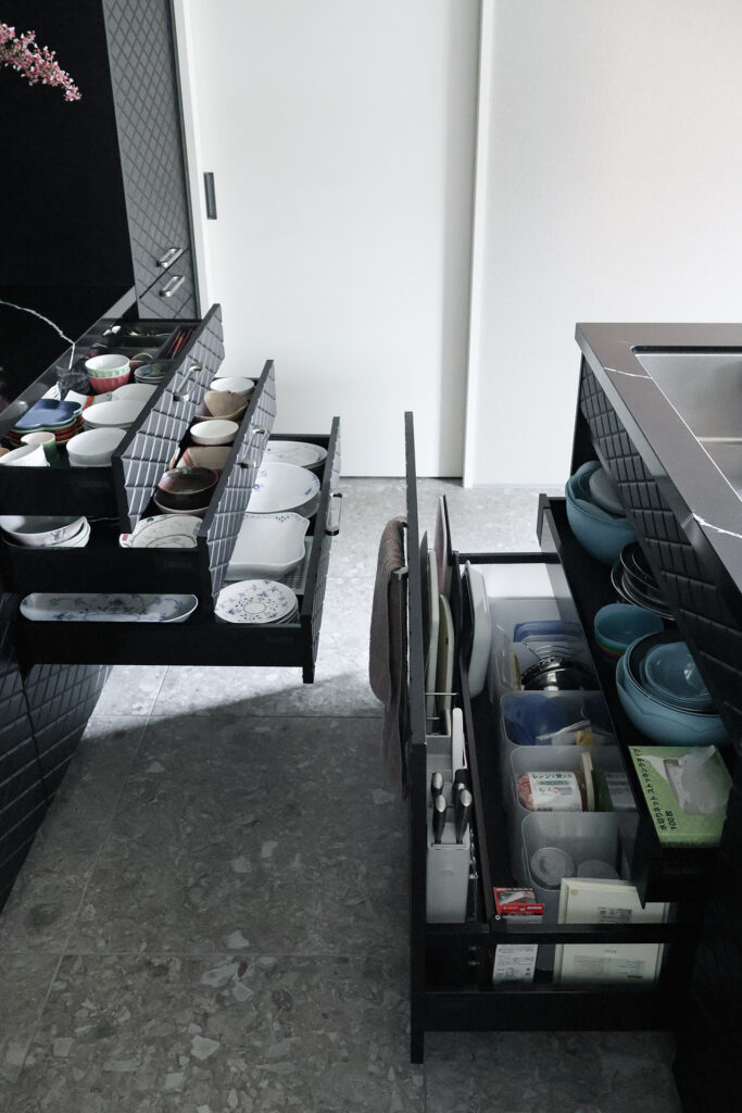 「ゲスト用の食器や大皿など、毎日使わないものは見た目のすっきりとした大きな扉の中に、インセットの引き出しを設けて収納しています。」