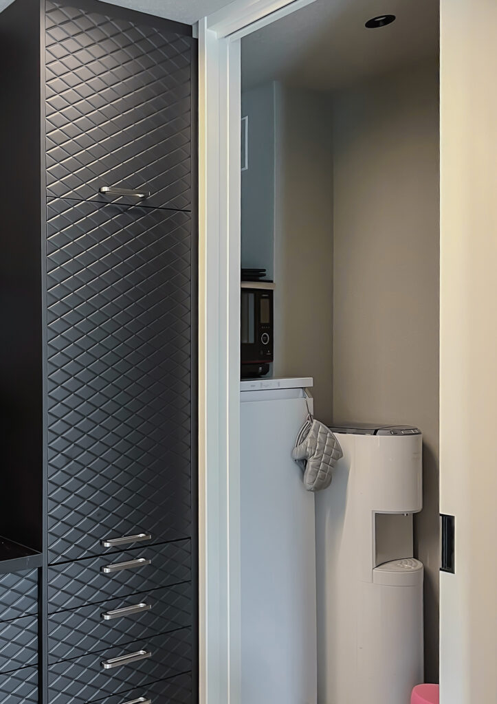 右側のパントリーには冷蔵庫とウォーターサーバー、左側にはゴミ箱・食品ストックetc…