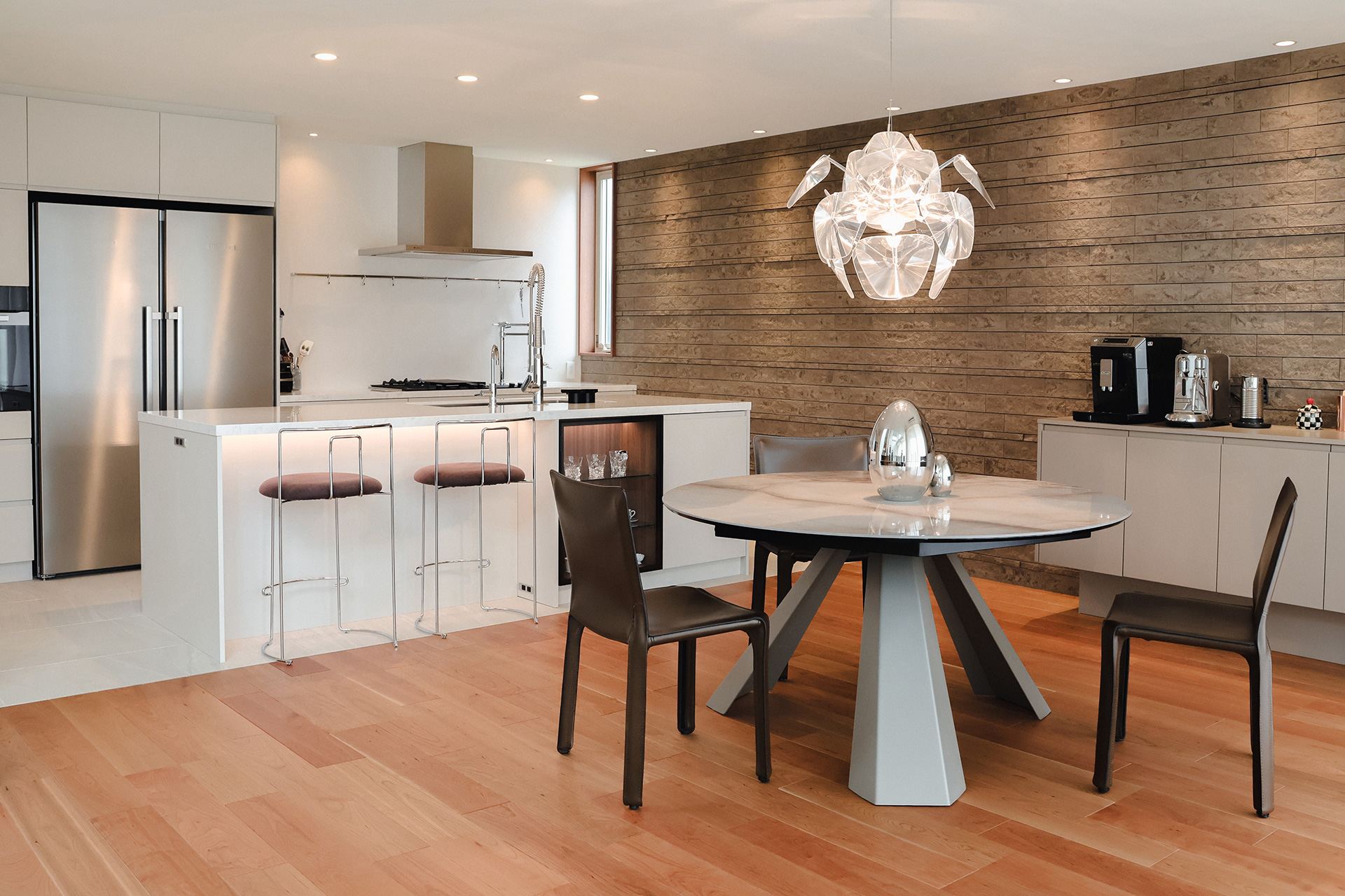 「夫婦ともにコーヒーをよく飲むので、まず、お気に入りのコーヒーメーカーを置く場所としてサイズを決めました。飲みたい時に、テーブルからすぐに手が届き、ダイニング側に置けたことで、キッチンもスッキリするし、とっても気に入っています。空間のゆったり感を優先し、収納は最低限にしているので、リビングダイニング関連のものは全てこの中に納めています。コーヒー関係やお菓子、お酒、郵便物や書類まで。結構な収納力があります。」
