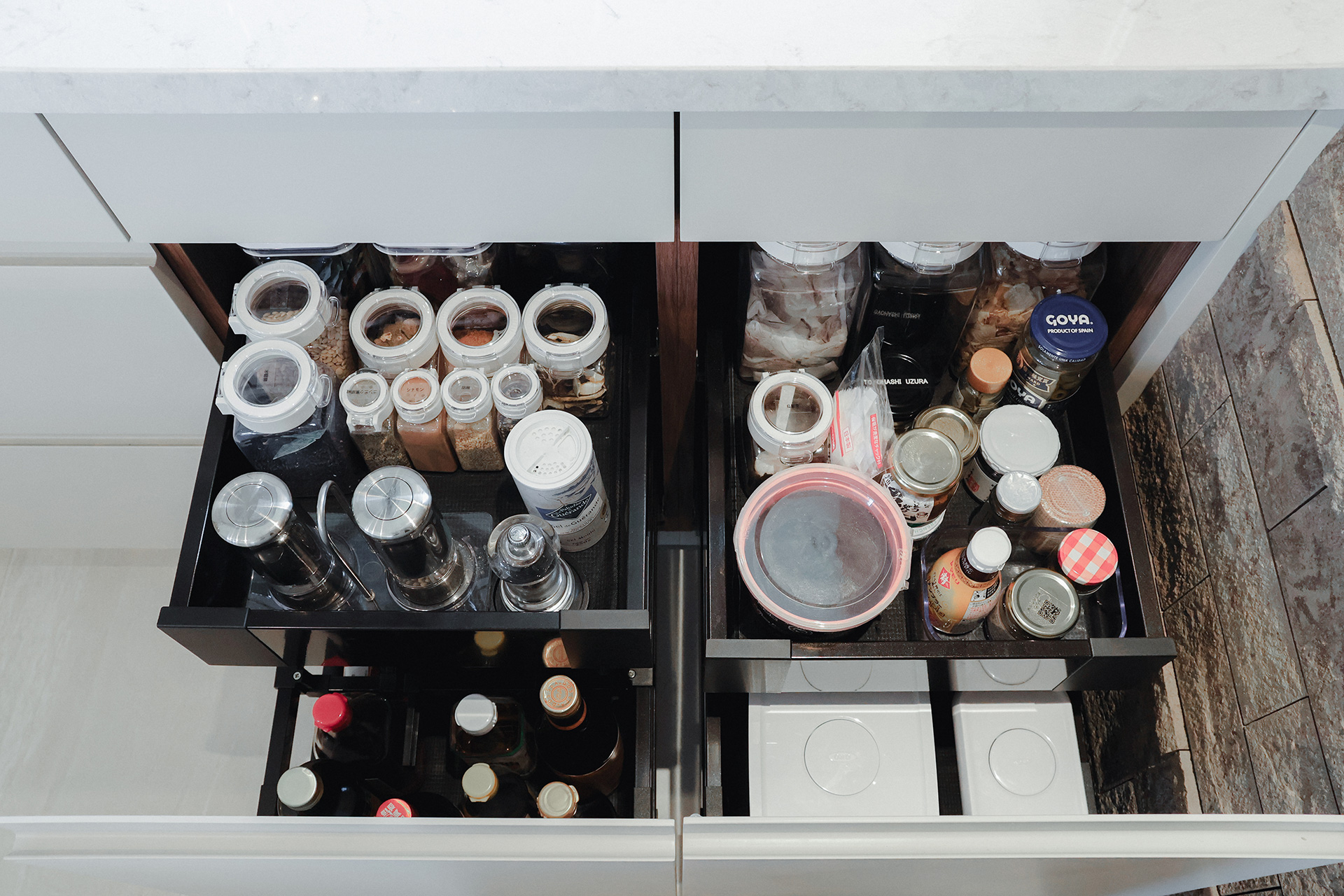 コンロ脇にはスパイスや、油類。加熱調理中に必要な道具などを収納。容器は同じもので揃えることで、より効率よく収まっています。