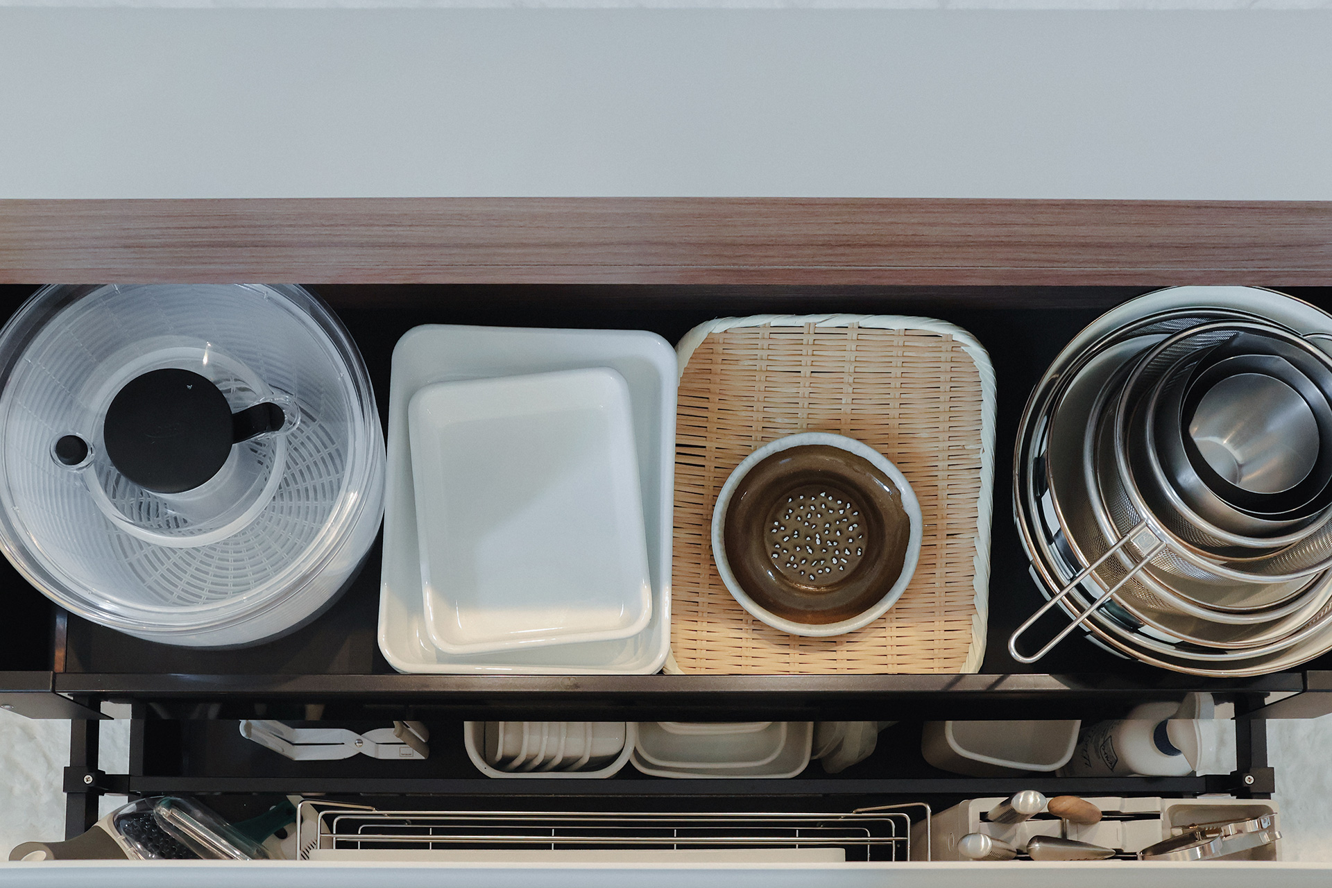 シンク下には、ボウルやざる・バット・お米...水仕事でさっと取り出したいものが、分類されて収められています。