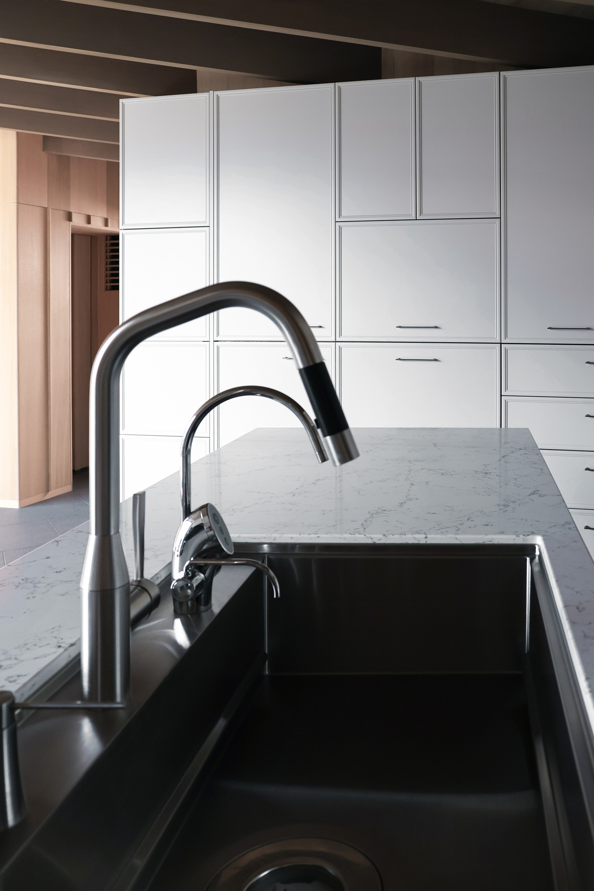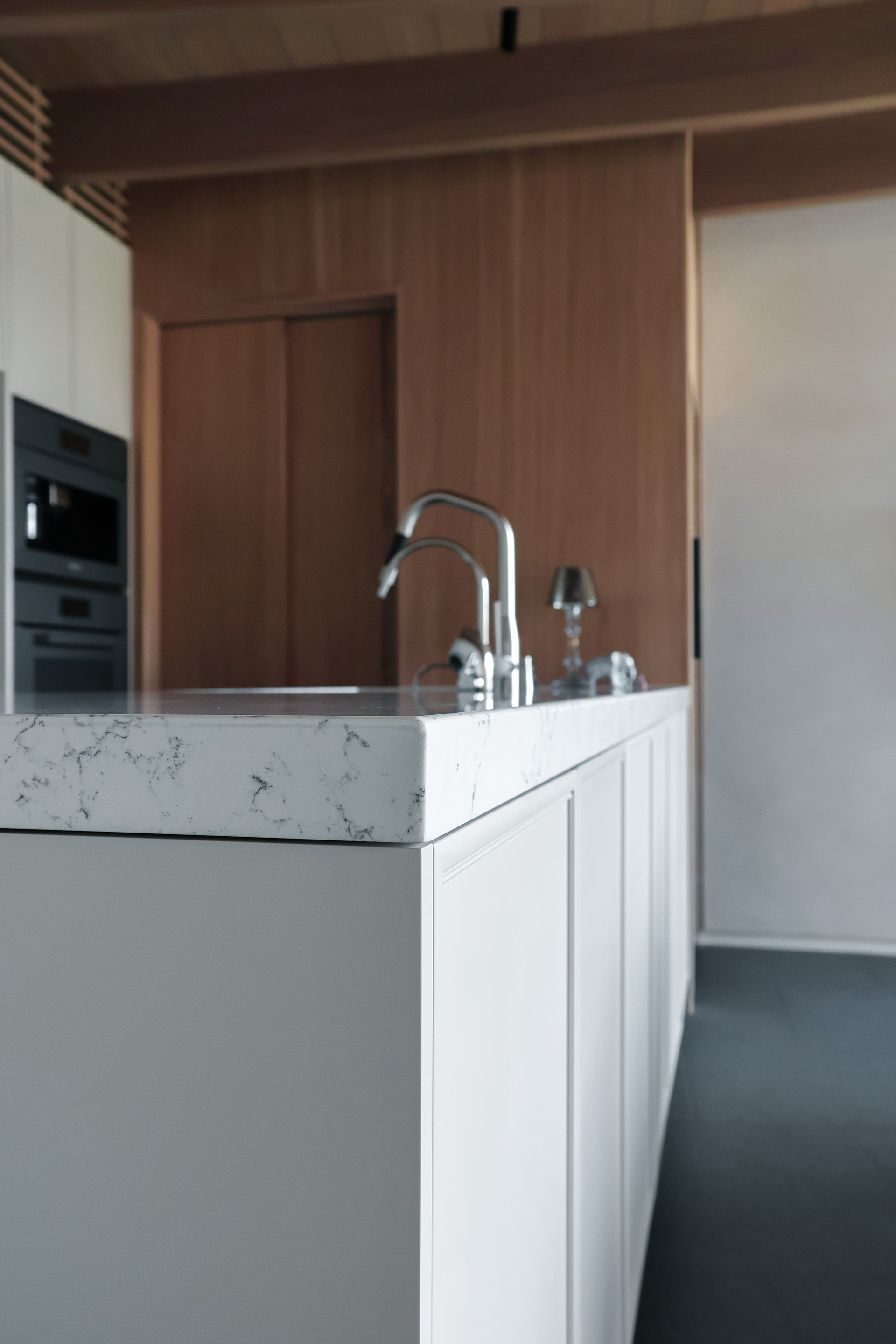 クオーツストーンのカウンターは特注の厚み50mm。角のRも扉のデザインに合わせて丸みを持たせたのは、建築家の先生のこだわり。 「出来上がりを見て、そこまでこだわられた意味がわかりました」と話すのはクチーナの担当者。
