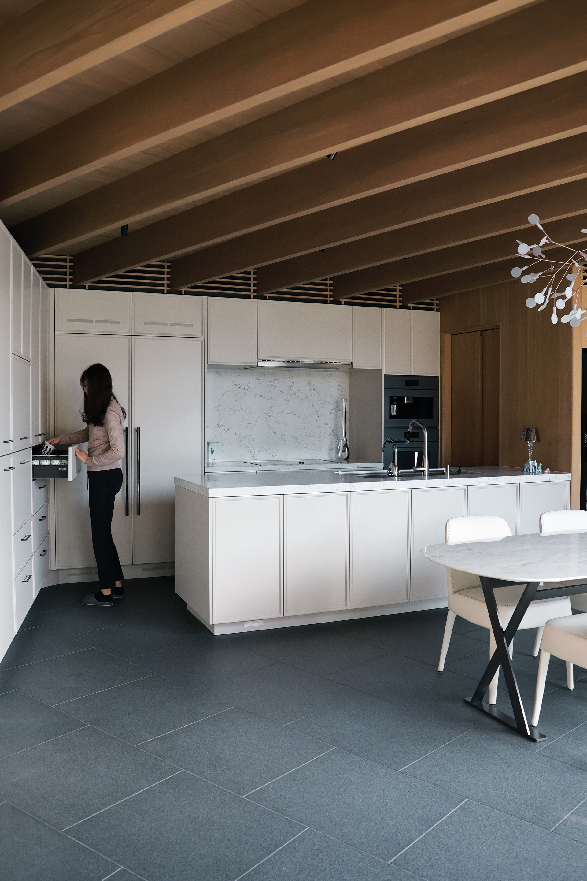 素材感豊かな天然木と石で構成された精緻を極めた空間。 淡い色合いが美しいクチーナのキッチンがやさしいリズムを奏でます。 窓の外の緑を眺めながらゆったりとした時間を。