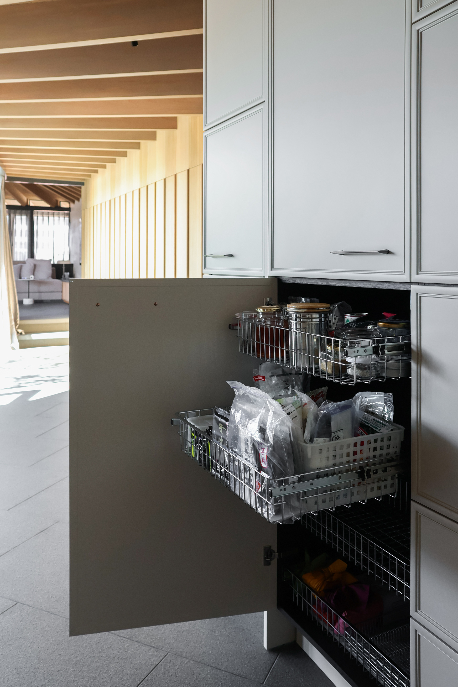 サイズ感もまちまちで収納しずらい乾物類は、細かく仕切らずにざっと入れられるバスケットタイプの引き出しに。