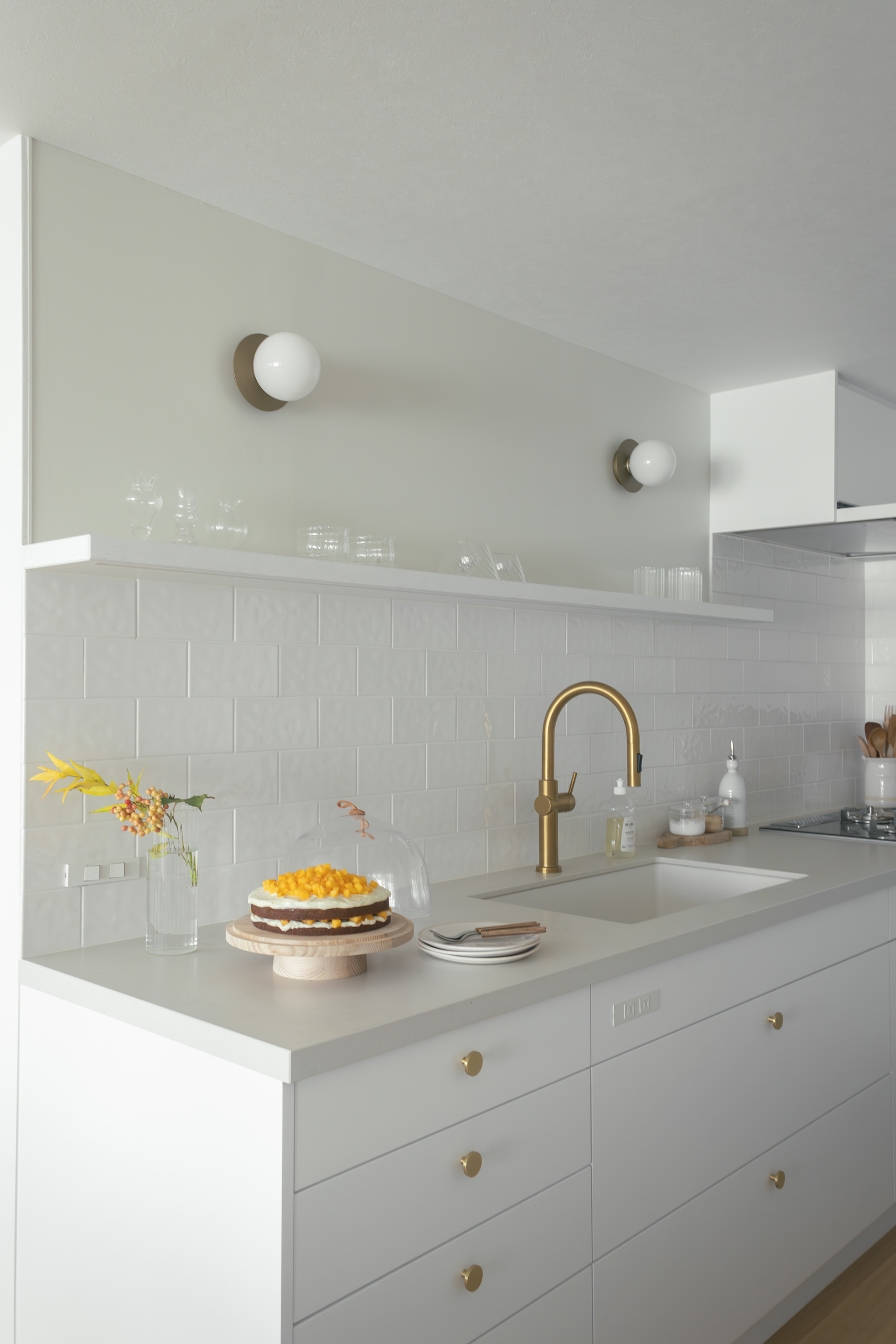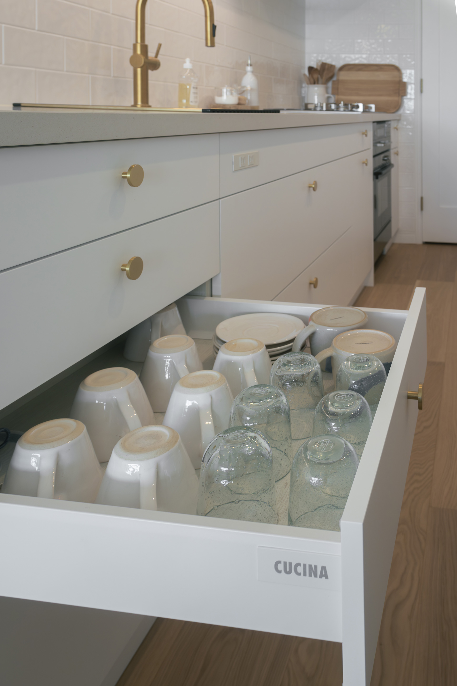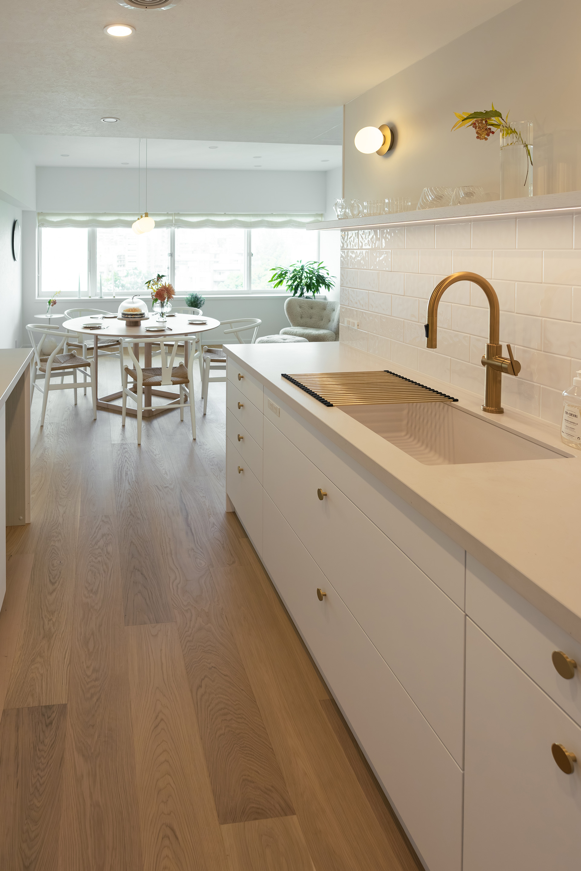 つまみ・水栓・照明やドアノブなどの金属素材は、 艶を押さえた上品なゴールドで統一。キッチンを限りなくシンプルにまとめたことで、その美しさが引き立ちます。
