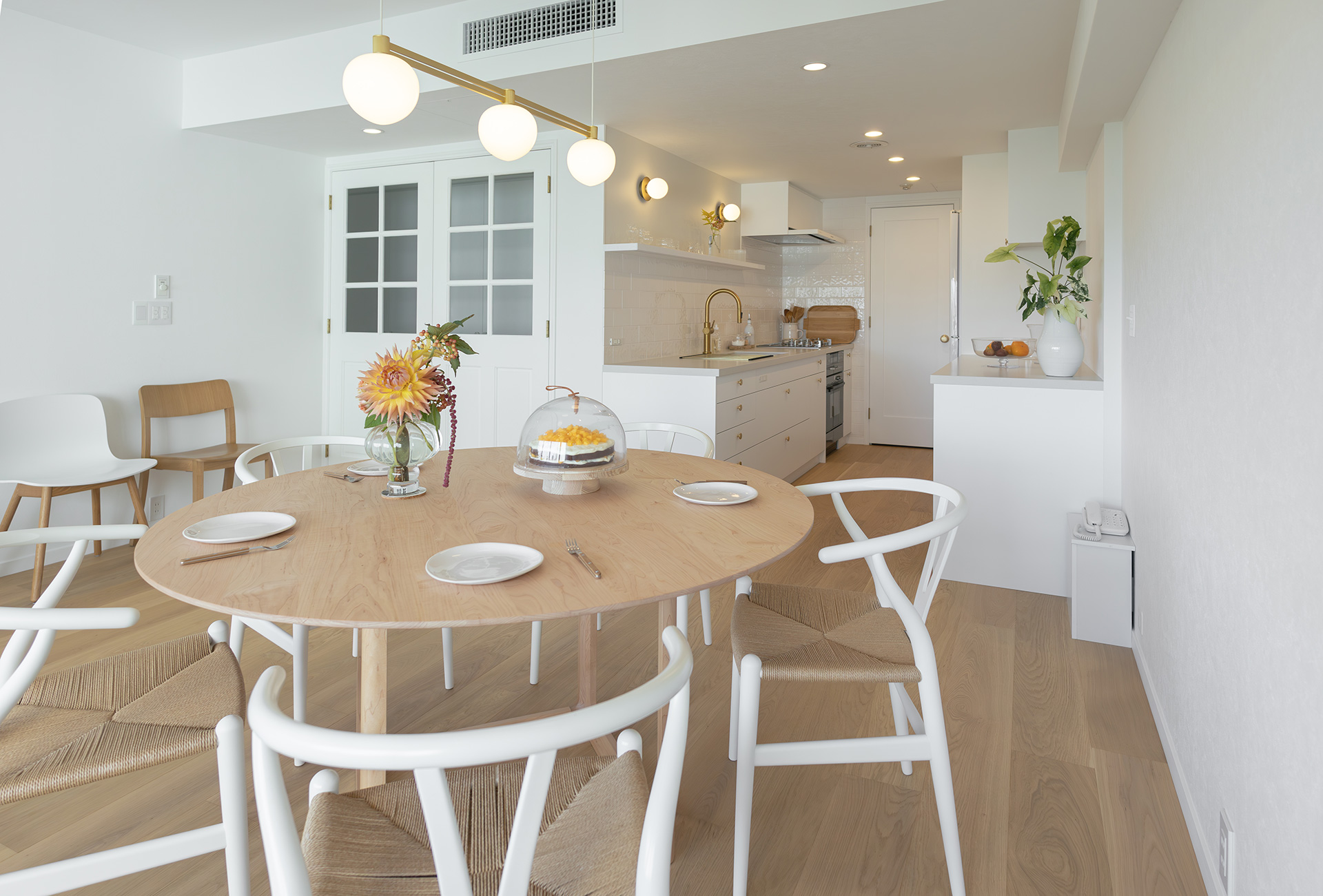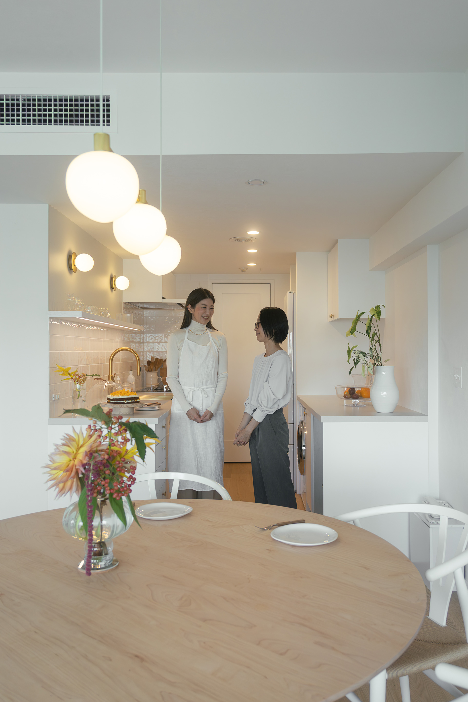 キッチン単体ではなく、 まずは壁・床・建具や家具... 全体を俯瞰して見て、その上で キッチンひとつひとつのパーツを 選んでいったことで、お部屋全体が調和する美しい空間に。 お母様の生けられたお花が彩りを添えています。