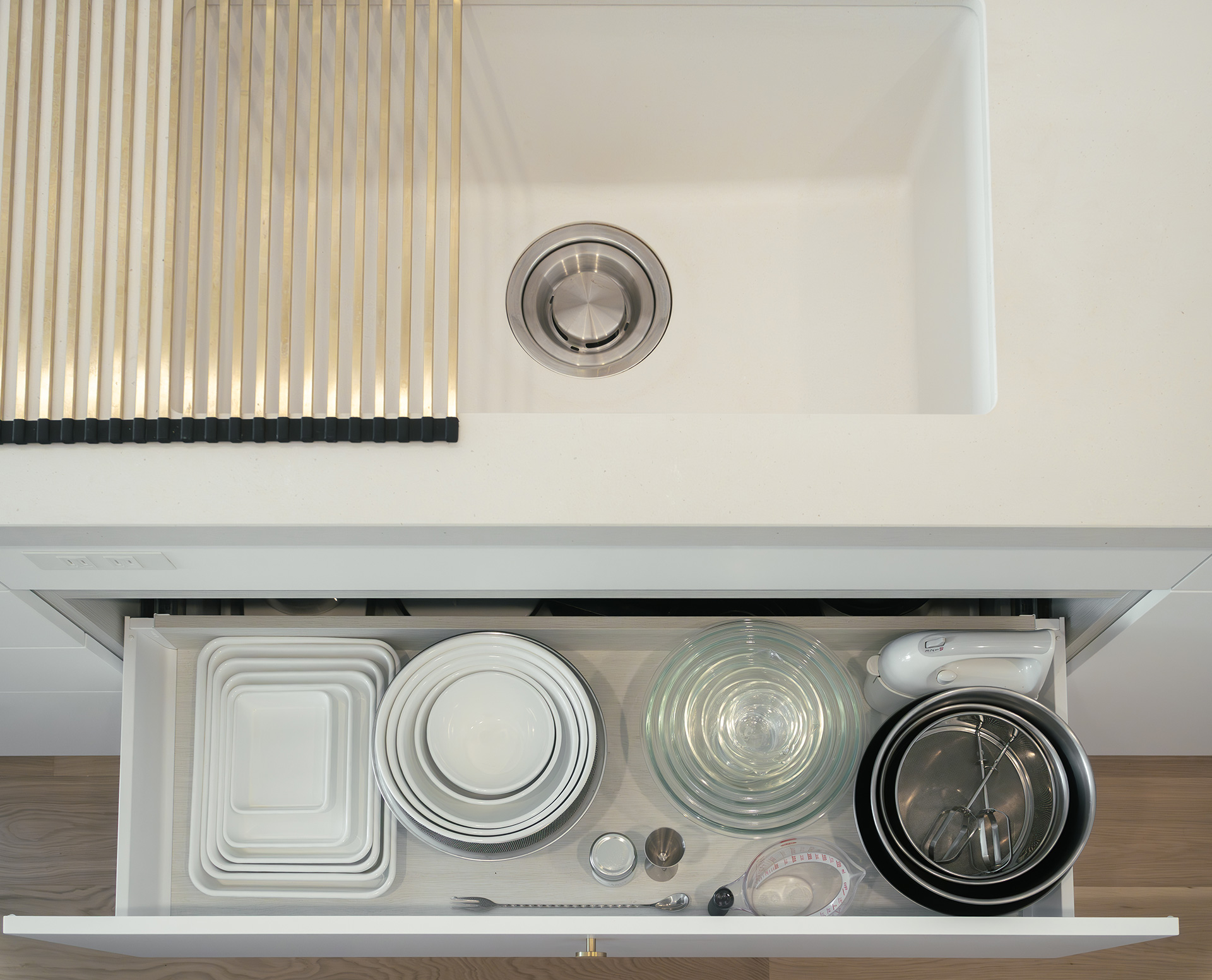 シンク下の大きな引き出しには お菓子作りのたくさんの道具が収納されています。 ダイニング側の引き出しには食器類を収納。