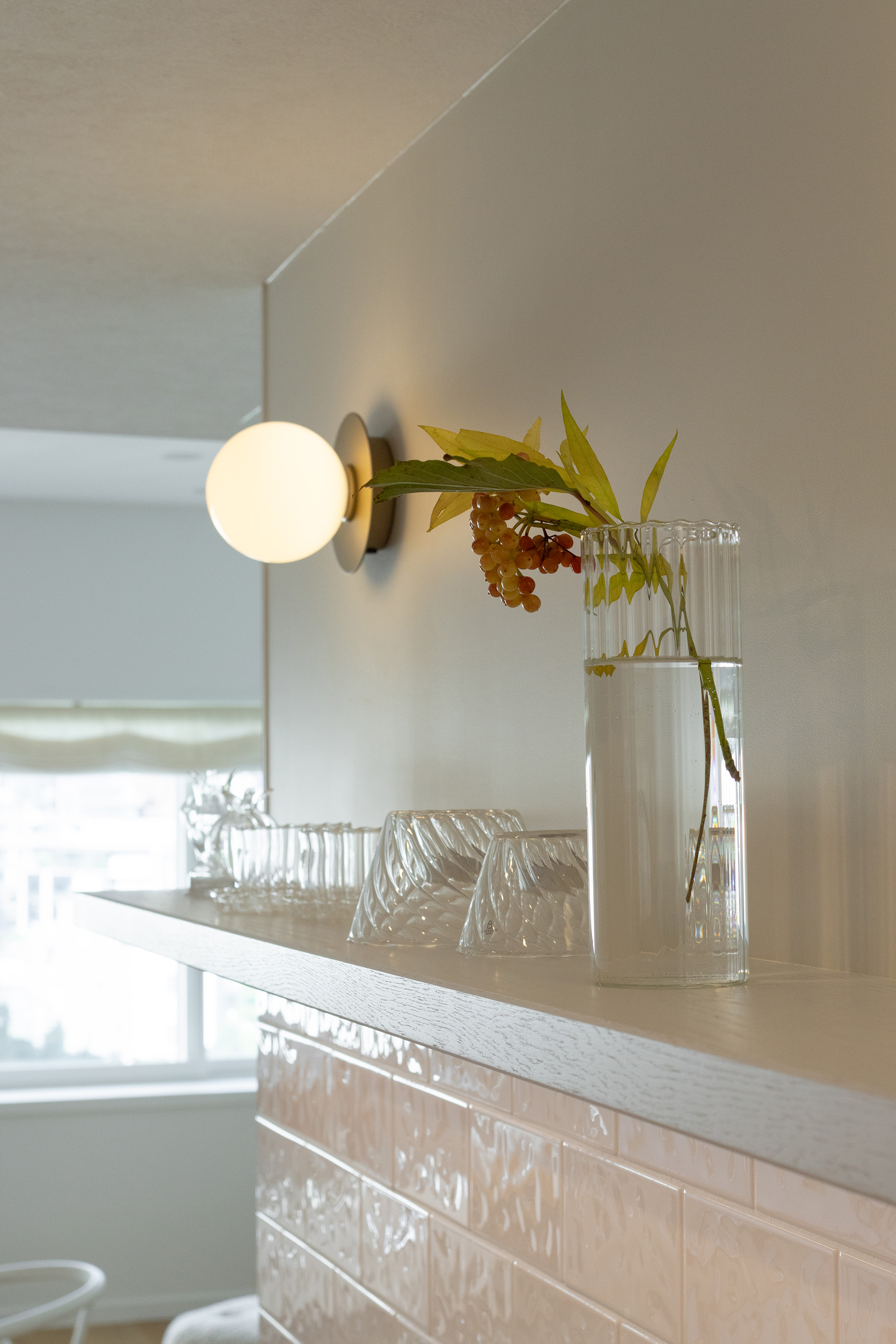 「お気に入りのグラスやお花を飾って楽しんでいます。 飾り棚には間接照明をつけました。 時間やシーンで灯りを使い分けて過ごしています。」