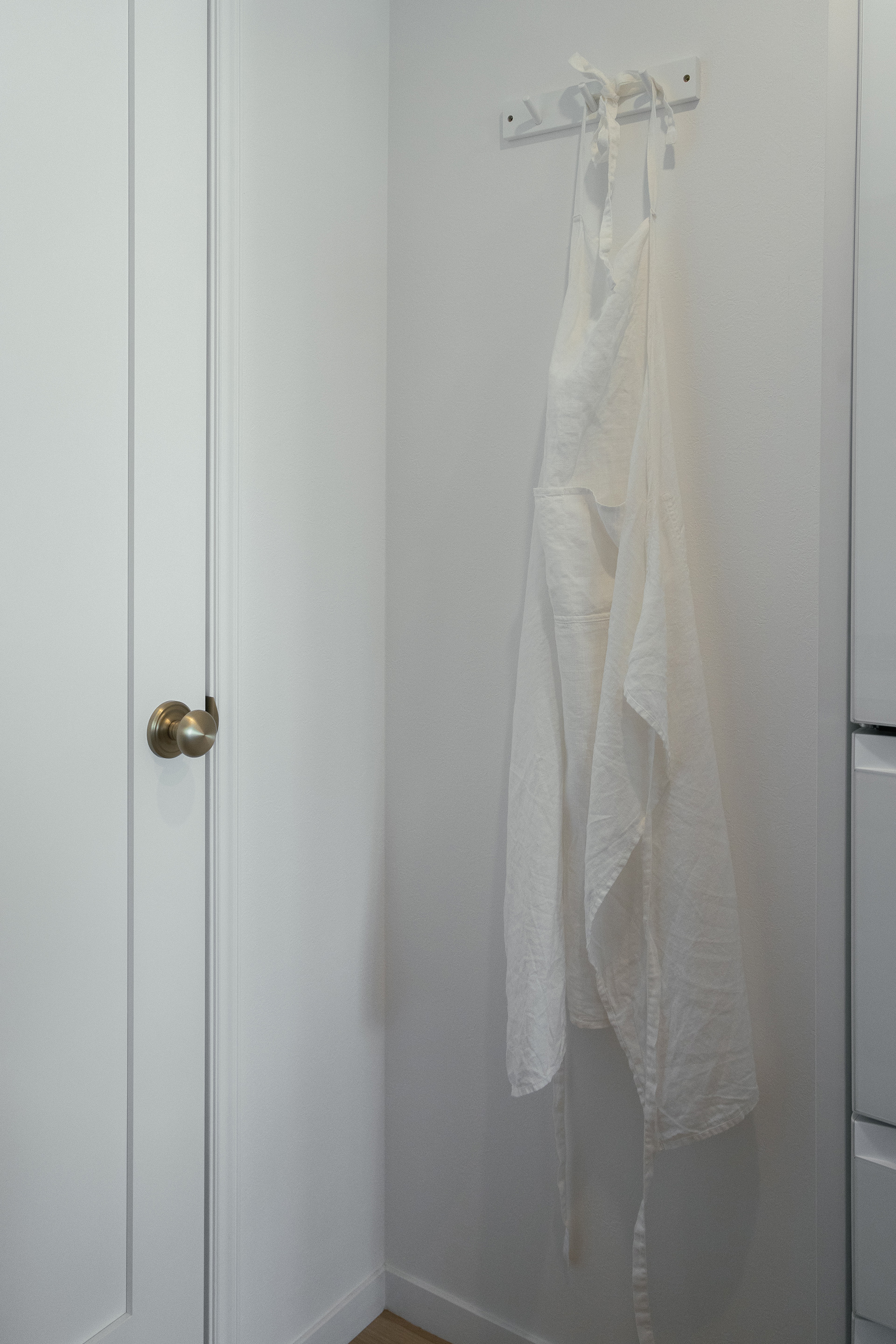 置き場に困るエプロンは 冷蔵庫とのちょっとした隙間を活用して、 生活感を感じさせず美しく。