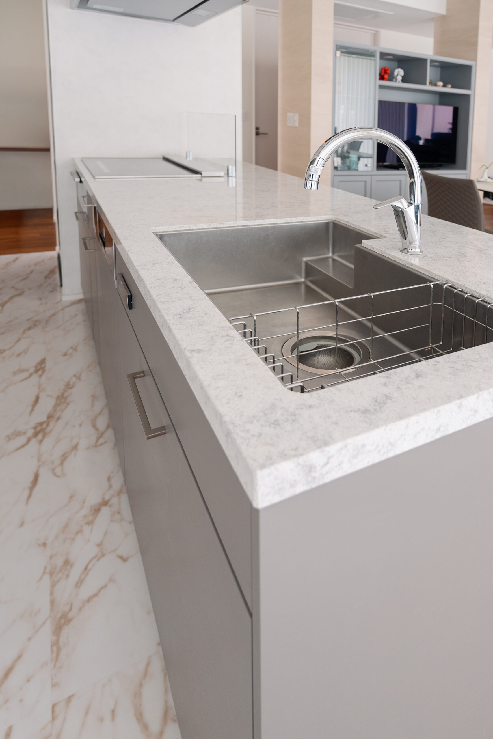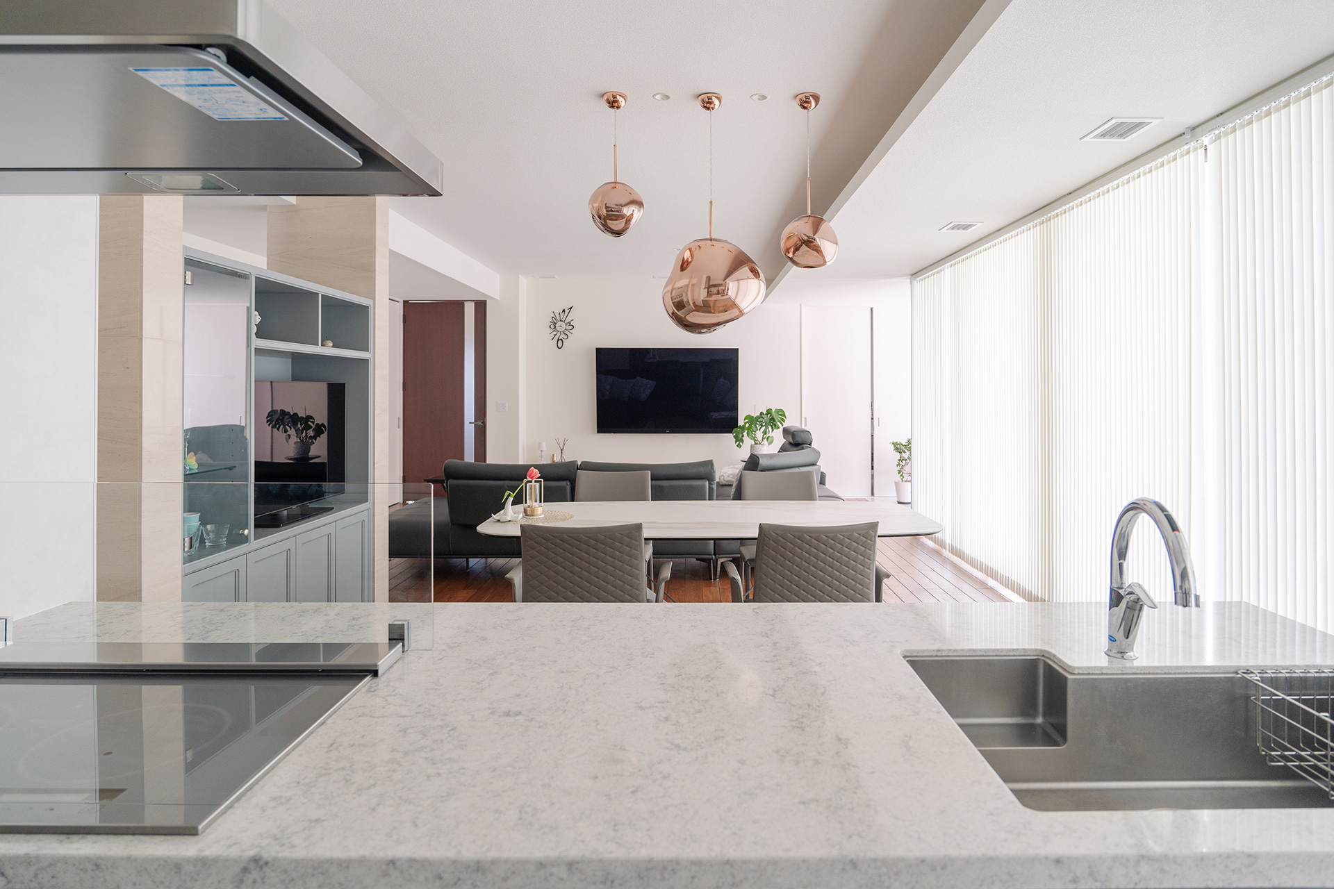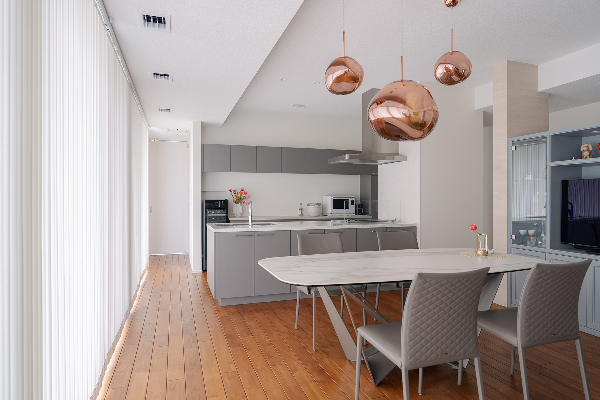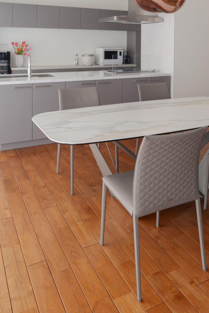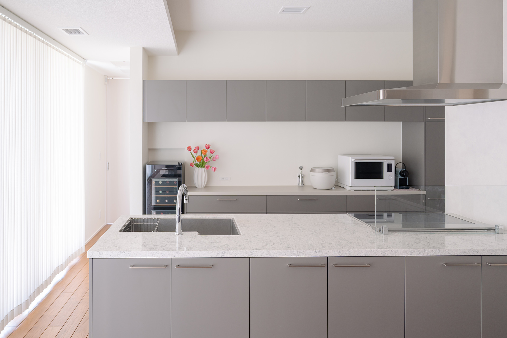 柔らかなグレートーンがお好きな奥さまが選んだのは、Cattelan Italiaの家具と調和する塗装扉。マットな質感が窓からの光をやさしく受け止め、流れるようなグレーの模様が入った天板と合わせて上品な空間に。