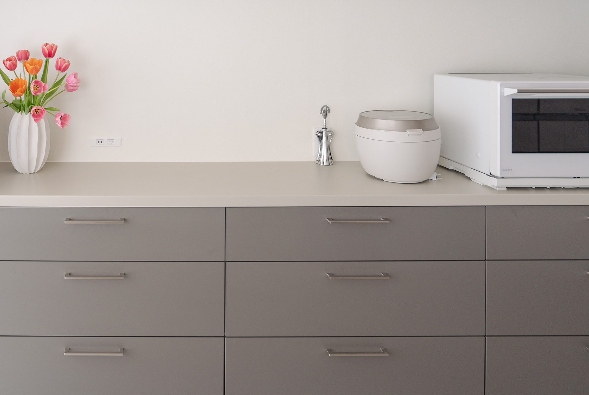 器がお好きなHさま。お気に入りをたっぷり収納できる引き出しを備えた、収納力のあるバックセットです。 レンジや炊飯器などの家電はデザインにこだわって選び、カウンター上に配置。 隠す・見せるを使い分けた、メリハリのある空間づくりが印象的。