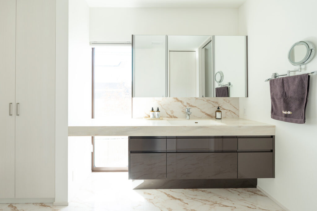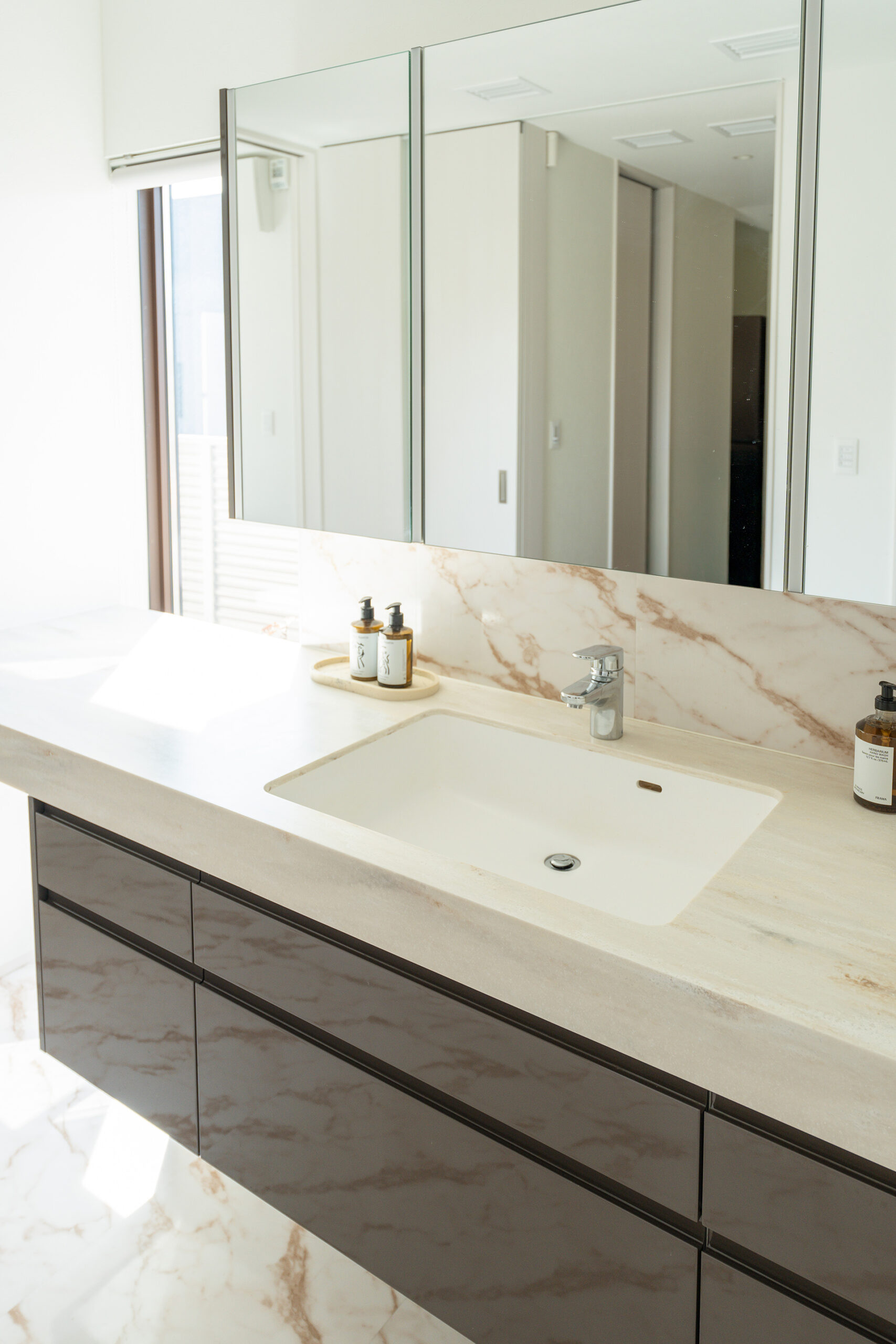 洗面は赤みのあるグレージュカラー。 艶のある仕上がりの塗装扉に、天板は厚みを持たせて、ホテルのような設えです。
