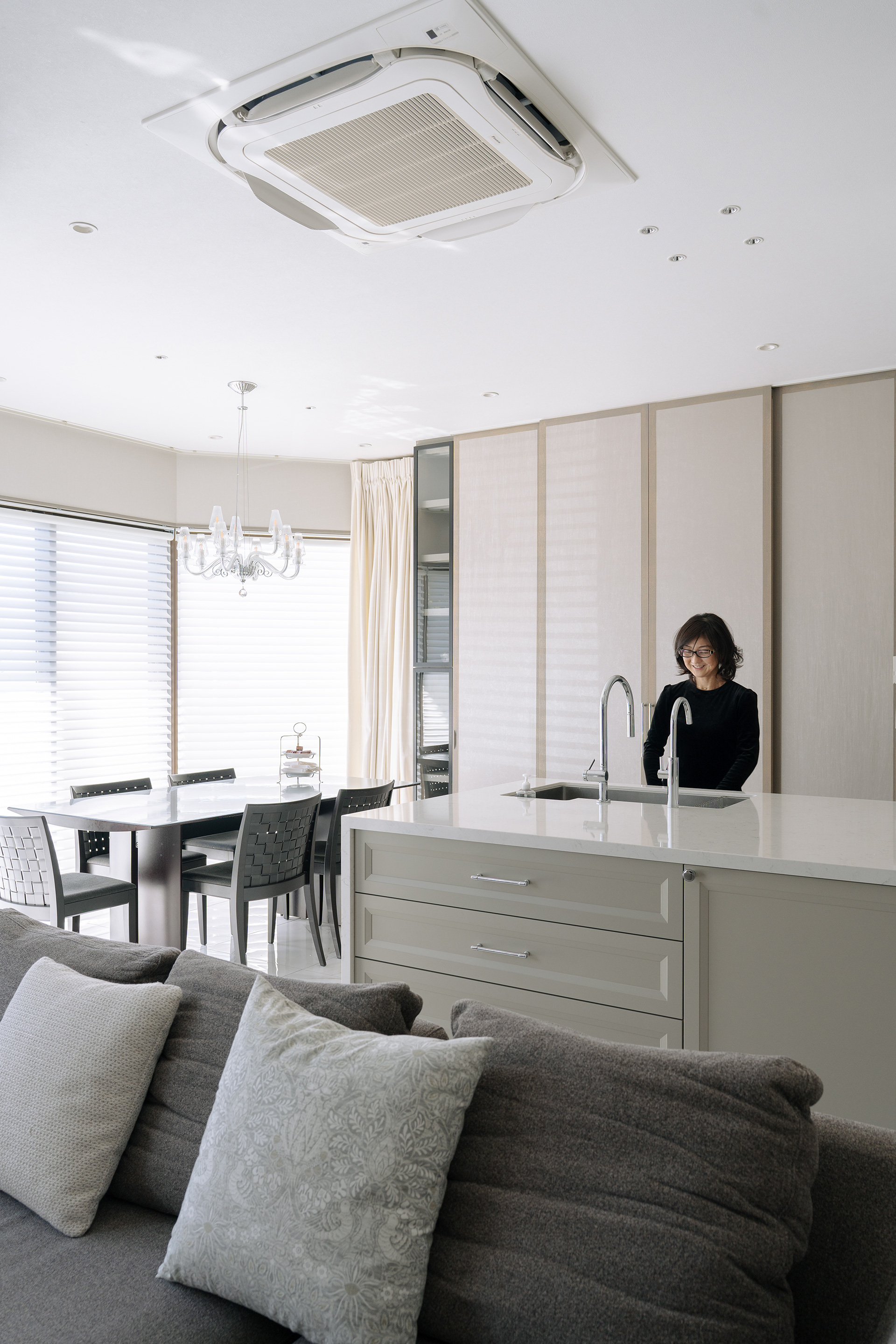 「リビングを向いて料理したい」そんな想いから始まったリフォーム。以前からの憧れのデザイナーさんとの家づくりで、 好きを詰め込んだ、美しく心地よい空間が完成しました。