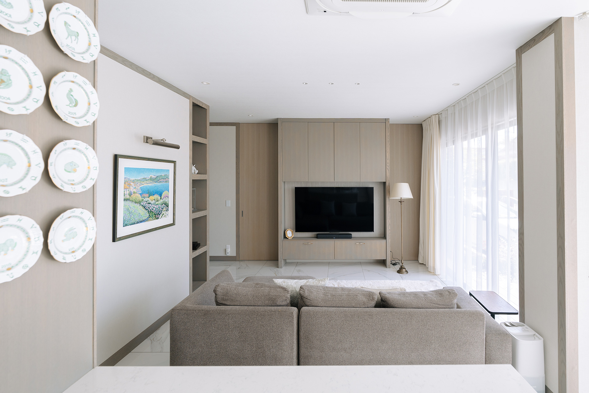 ご自身の“好き”を丁寧に伝え、デザイナーが見事にまとめあげたLDK。 美しくバランスのとれた柔らかなカラーが、穏やかに空間全体になじんでいます。