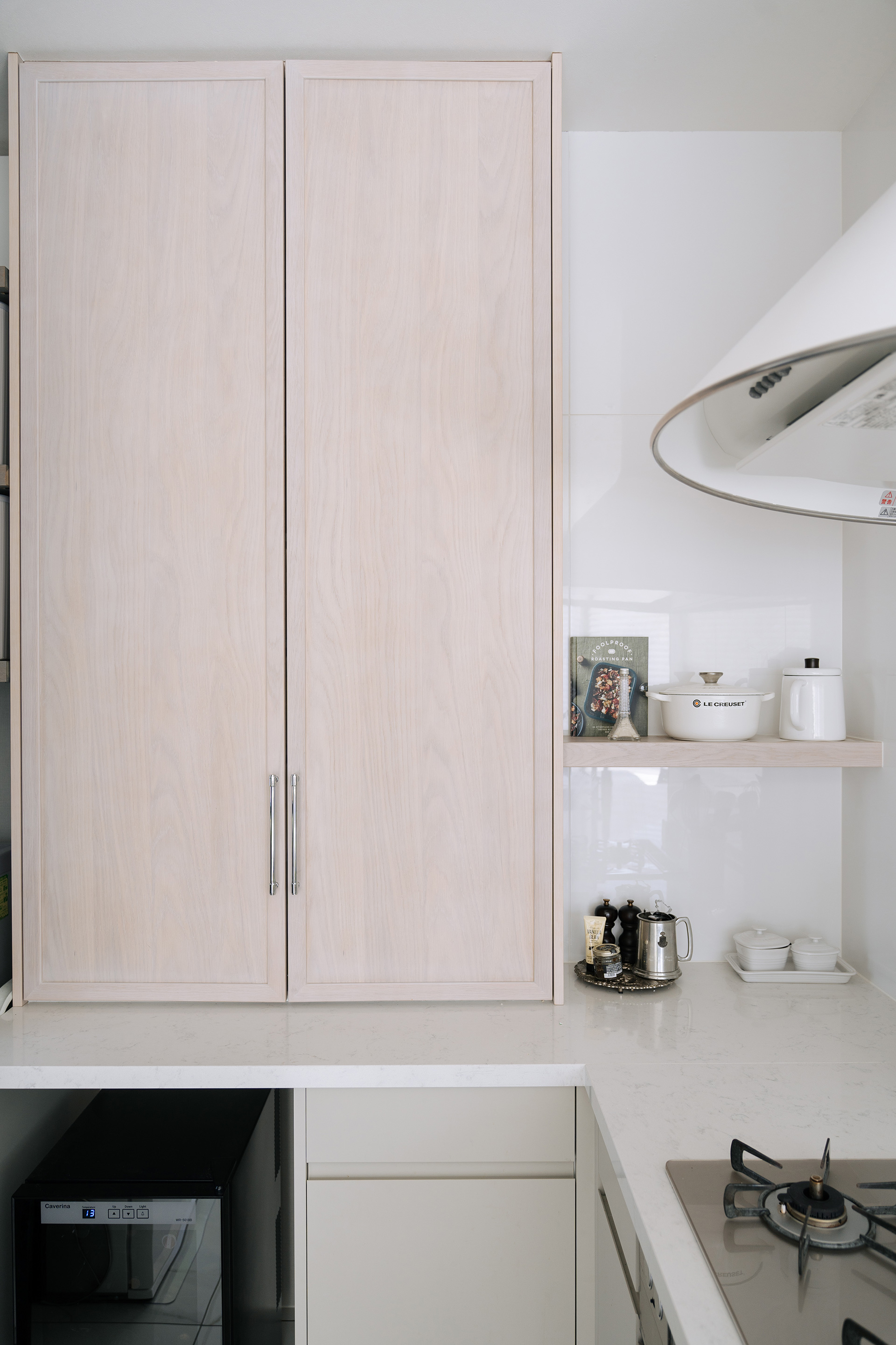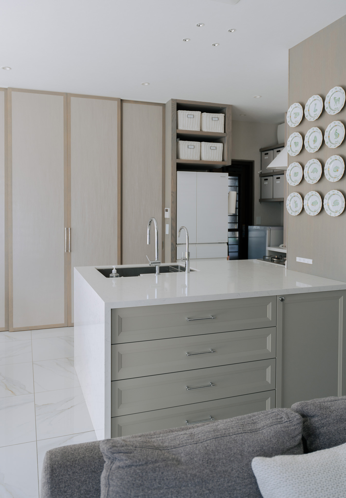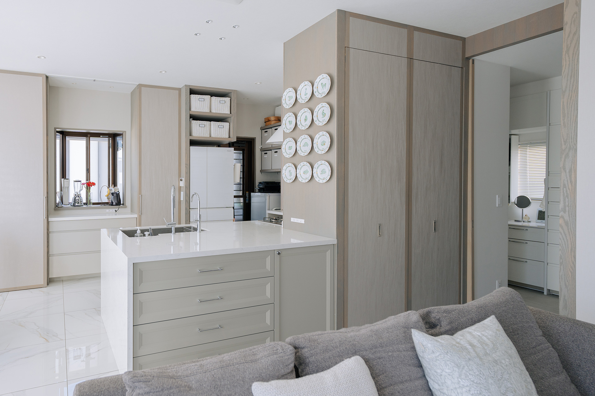 キッチン奥の大きな扉は、あえて異なるデザインを採用。閉じているときは空間のアクセントに、開けたときも美しく、中のものを取り出す所作まで絵になります。