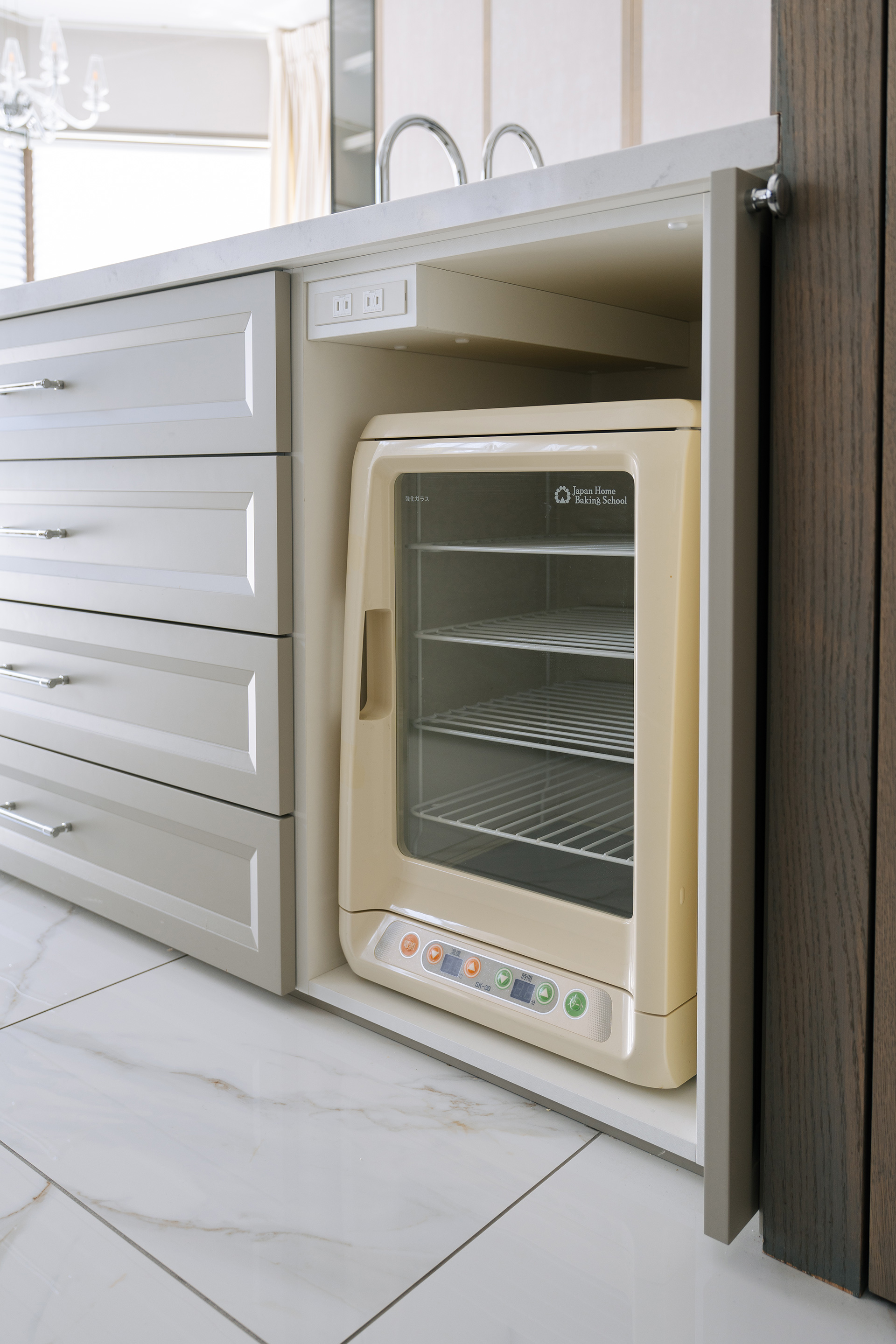 パンの発酵機は開き扉の中に。 カウンターでブレンダーなどが使えるよう、扉内にはコンセントも完備。扉はサイドに収納できる仕様で、開けたままでも作業を妨げません。